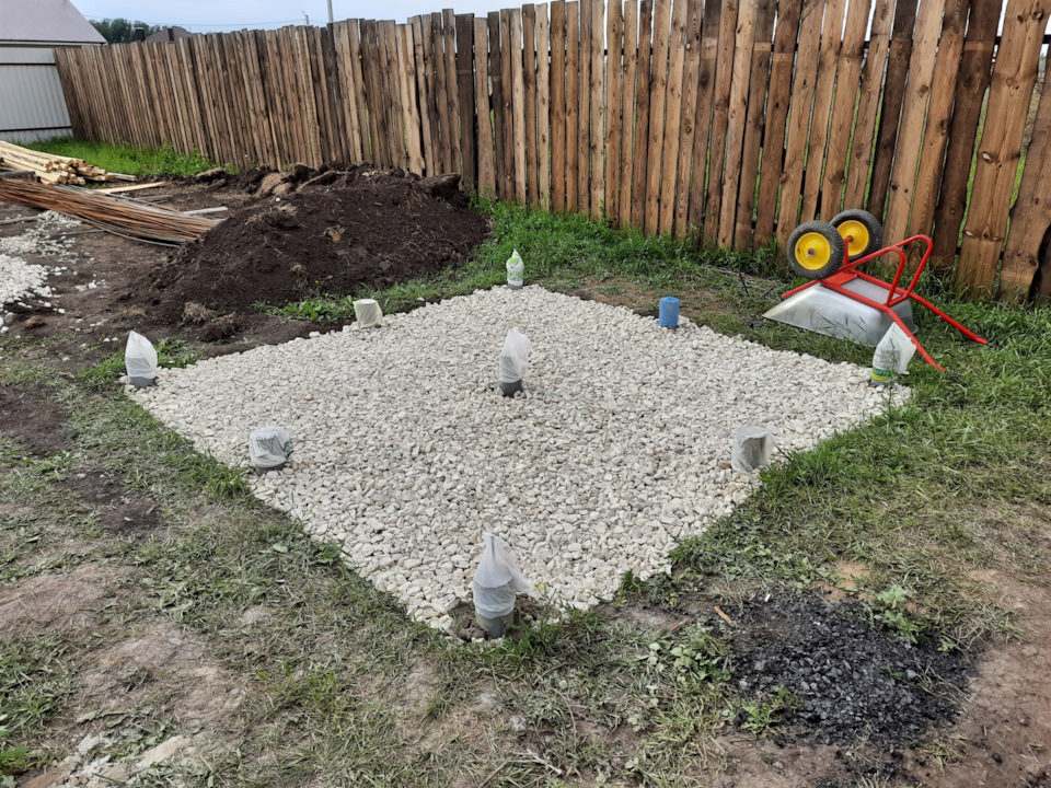 Сначала сняли слой грунта, накидали щебня, на него блоки и обвязка из бруса.