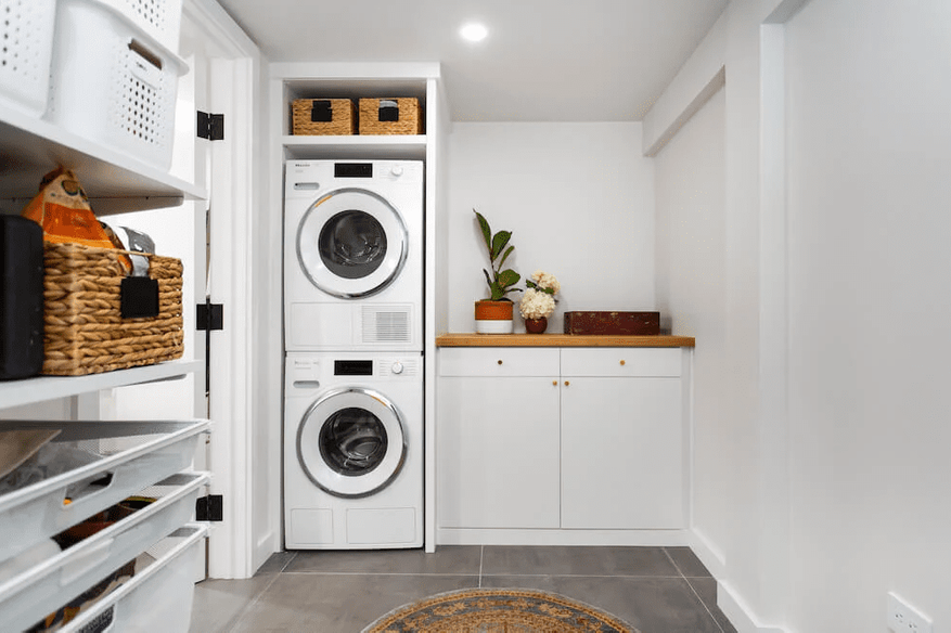 - Компактность. Хотя некоторые модели не являются встраиваемыми, они всё равно занимают гораздо меньше места, нежели сушильные шкафы ростом с человека. Иногда функция сушки встраивается в стиральную машинку. Такой вариант, по сути, не занимает лишнего места, однако комбинированные устройства — не лучшее решение, если вы планируете регулярно пользоваться сушилкой.