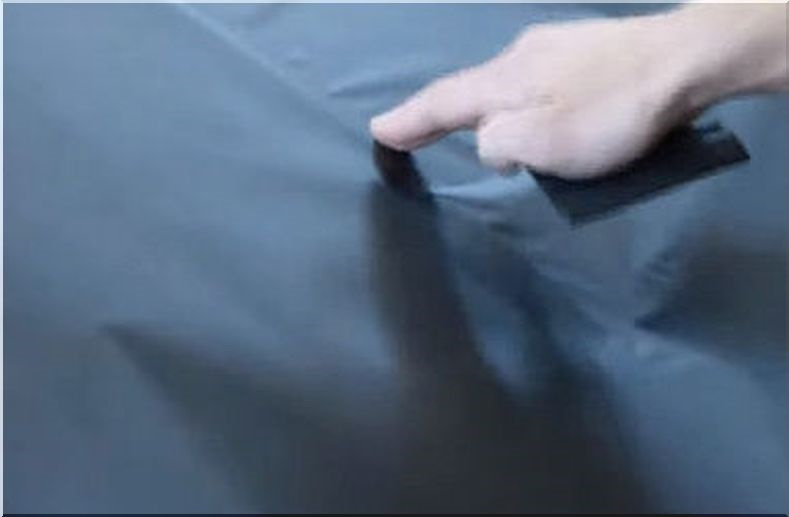 - Начните аккуратно разглаживать пленку ракелем, двигаясь от центра к краям. Старайтесь избегать появления складок и пузырей на пленке. Если складка все-таки появилась, аккуратно отделите пленку от поверхности, расправьте ее и заново приклейте. Равномерно прогрейте пленку феном. Это нужно для активизации клеевого слоя и лучшей его адгезии к поверхности. При этом важно не перегреть пленку.